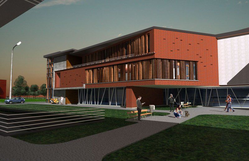 Slēgtais futbola laukums līdz pusei iegremdēts zem zemes, un tā malās izvietoti biroji, lai apjoms iekļautos Mežaparka vidē.